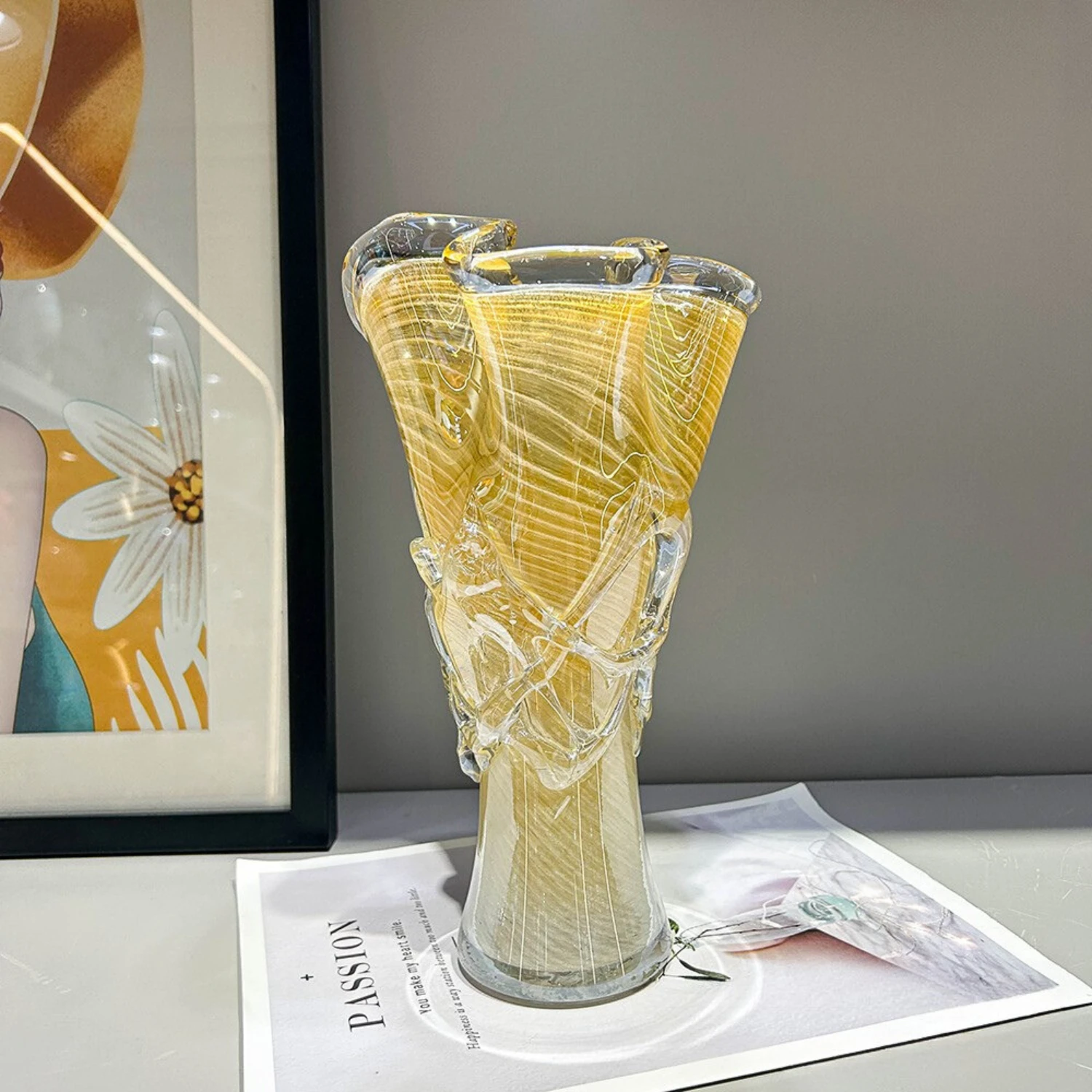 Tông vàng pha lê của sản phẩm mang đến sự ấm áp, dễ kết hợp với nhiều chất liệu nội thất khác nhau. Trong không gian tông trắng – be – kem, bình hoa trở thành điểm sáng nhẹ nhàng; còn trong không gian đen hoặc nâu trầm, nó lại tạo hiệu ứng tương phản sang trọng.